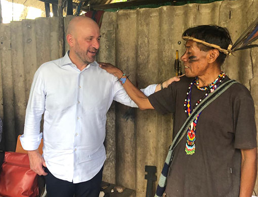 Septiembre 3 de 2019. Con un ritual ancestral con plantas y semillas de árboles, Chipe, una de las autoridades indígenas del Pueblo Hitnü, en representación del Gobierno Propio, dio la bienvenida a la primera visita a Arauca de Alberto Brunori, representante de la Alta Comisionada de la ONU para los Derechos Humanos.