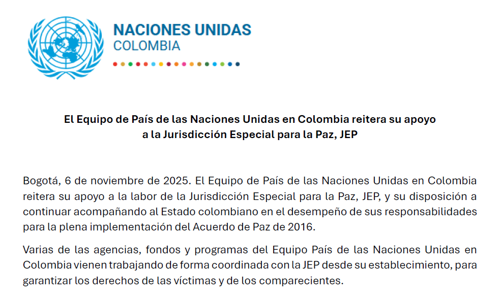 Bogotá, 6 de noviembre de 2025. El Equipo de País de las Naciones Unidas en Colombia reitera su apoyo a la labor de la Jurisdicción Especial para la Paz, JEP, y su disposición a continuar acompañando al Estado colombiano en el desempeño de sus responsabilidades para la plena implementación del Acuerdo de Paz de 2016.