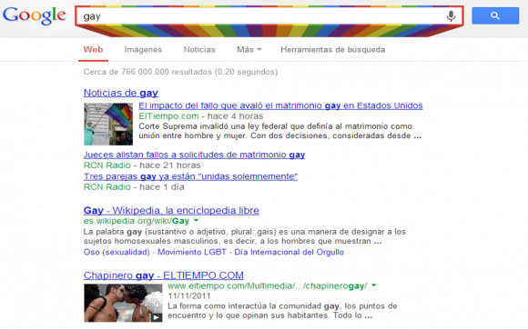 En estos momentos el motor de búsqueda Google demuestra su apoyo por el matrimonio igualitario. Al buscar la palabra “gay” aparece la bandera característica de la comunidad LGBTI alrededor del buscador. El día de hoy en Estados Unidos se declaró ilegal la ley DOMA que restringía el matrimonio a la unión solamente entre hombres y mujeres.